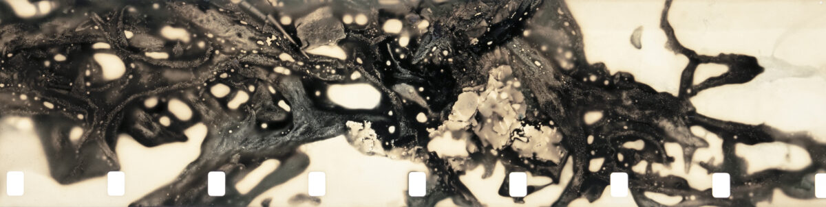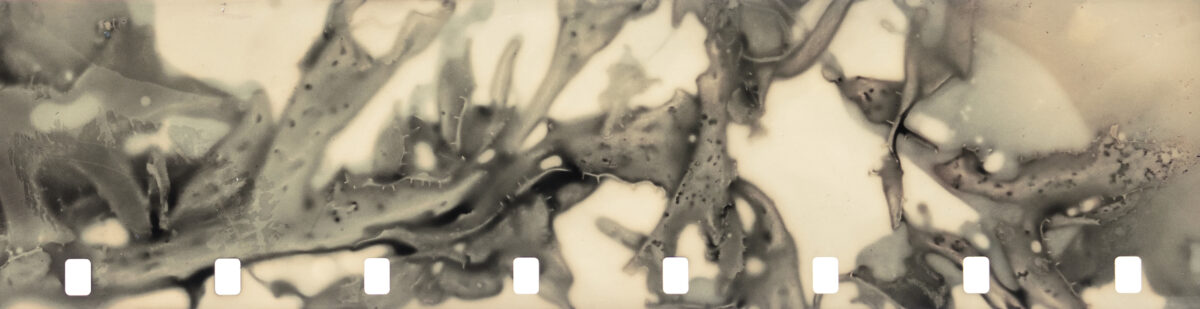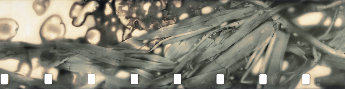 The images are chemigrams, a camera-less method, where, in this case, lichen and seaweed are directly embedded into the emulsion of a 16mm film.
